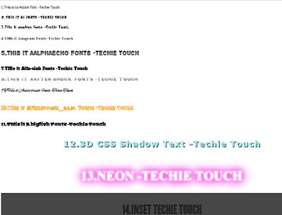 <h2 class="shdow">12.3D CSS Shadow Text -Techie Touch </h4>